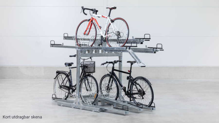 - Kort utdragbar skena – Hjälper till att placera cykeln på rätt plats, vilket ger en ordnad och effektiv parkering.