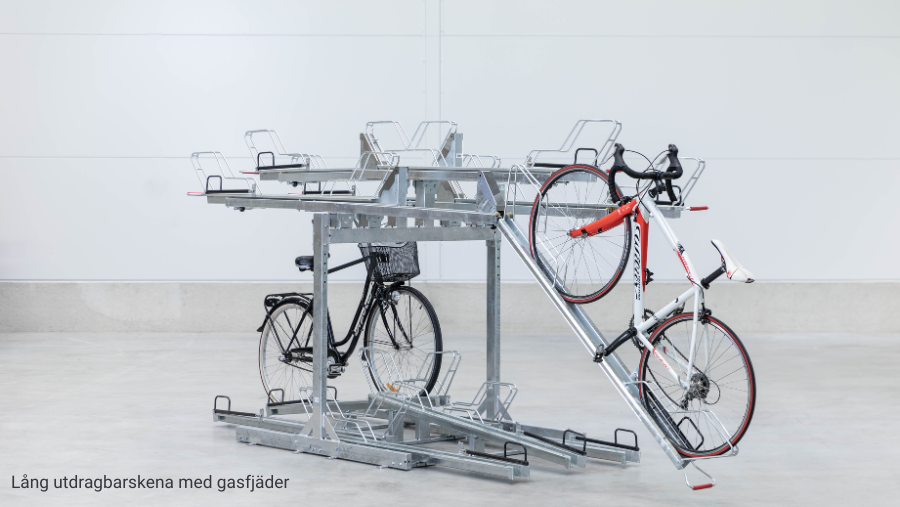 - Lång utdragbar skena med gasfjäder – För extra användarvänlighet. Gasfjädern gör att cyklarna lätt kan lyftas och sänkas, vilket ger en smidig och ergonomisk parkering.