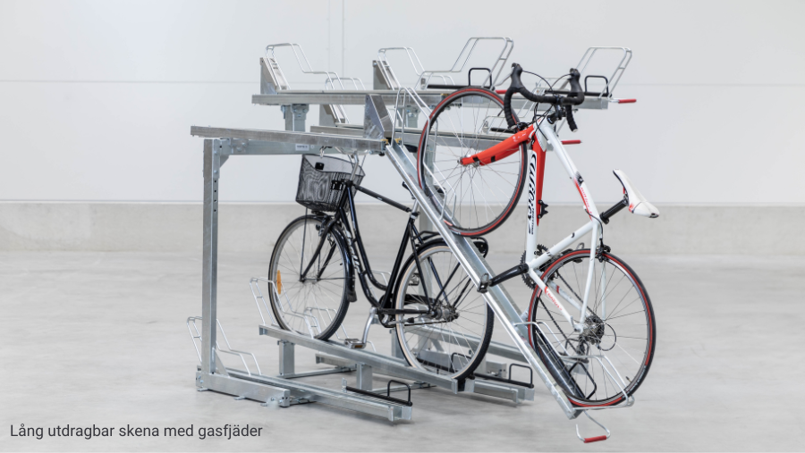 - Lång utdragbar skena med gasfjäder – För extra användarvänlighet. Gasfjädern gör att cyklarna lätt kan lyftas och sänkas, vilket ger en smidig och ergonomisk parkering.