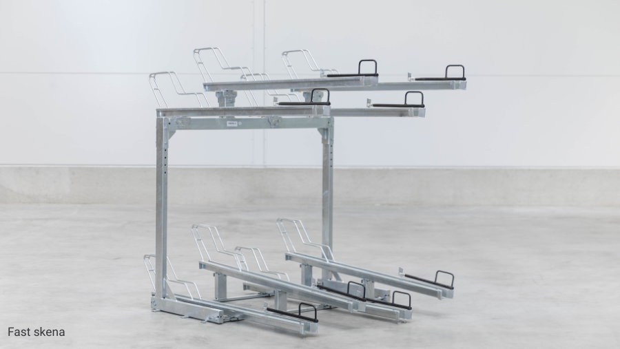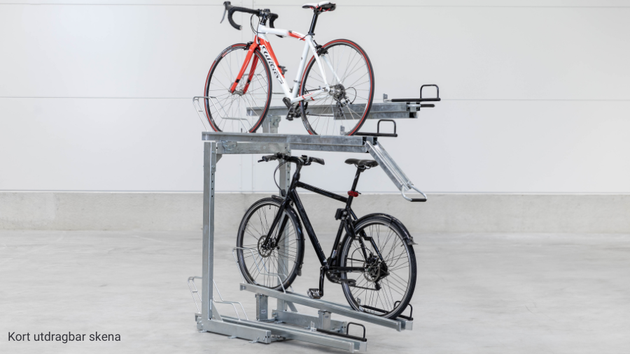 Vårt tvåvåningcykelställ är en smart och flexibel lösning. Det modulära systemet gör att du kan anpassa och utöka ditt cykelställ över tid, beroende på behov och utrymme. Välj mellan olika skenlösningar för att skapa den bästa parkeringen för just din verksamhet: